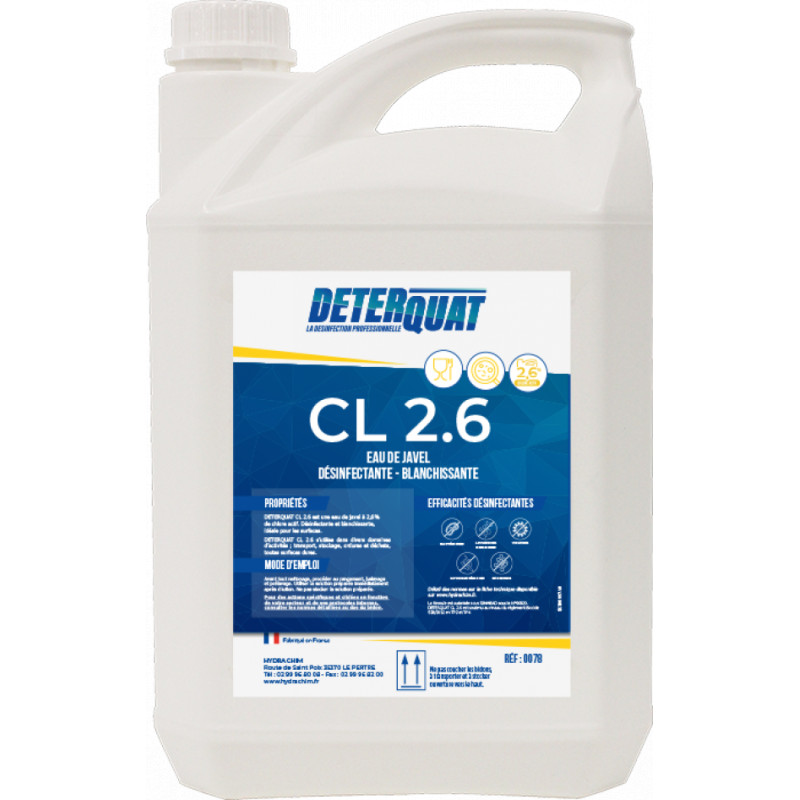 Eau de Javel 2,6 % (8°) : solution pro pour désinfecter, blanchir et désodoriser. Dosages standardisés, rinçage en contact alimentaire, usage HACCP.