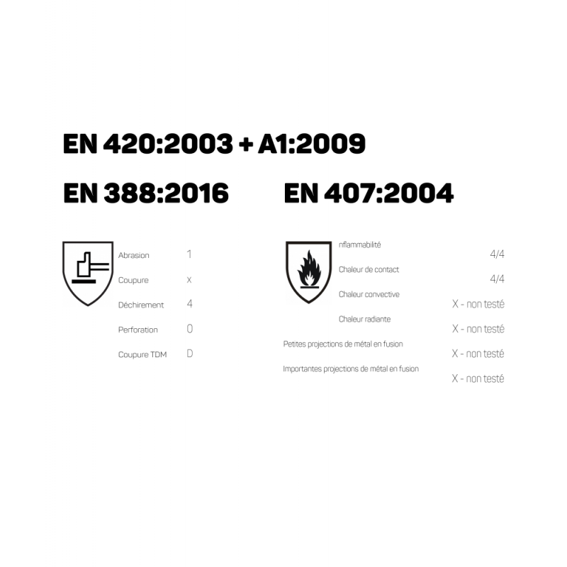 EN 420 (général), EN 388:2016 (abrasion 1, coupure X, déchirement 4, perforation 0) et EN 407 (chaleur/flammes).