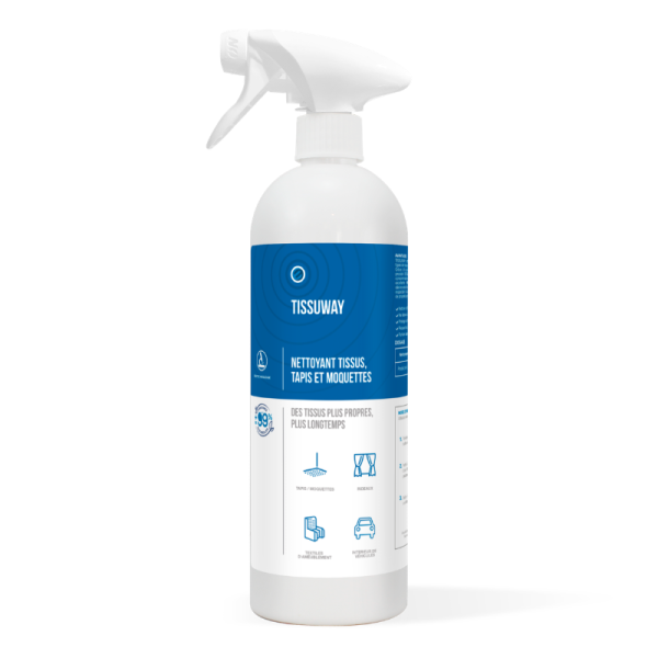 Tissuway est un nettoyant détachant prêt à l’emploi spécialement formulé pour l’entretien des tissus, tapis et moquettes. Sa technologie à base de biosurfactants issus de biotechnologies agit directement au cœur de la fibre afin de désincruster les salissures tout en respectant la structure et la couleur des textiles.