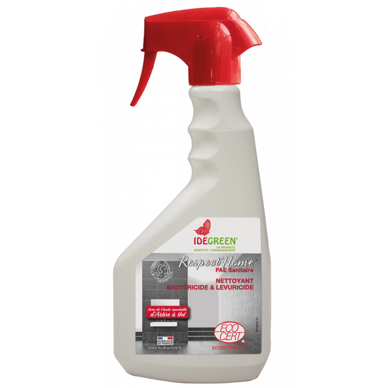 RESPECT’HOME® PAE Sanitaire est un nettoyant détartrant désinfectant écologique prêt à l’emploi. Formulé à base d’acide lactique et d’huile essentielle d’arbre à thé, il nettoie, détartre et désinfecte les surfaces sanitaires tout en respectant l’environnement.