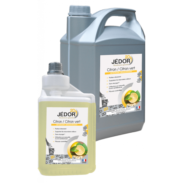 Jedor 2D Citron vert est un nettoyant surodorant sans rinçage qui élimine les odeurs et parfume durablement sols et surfaces.