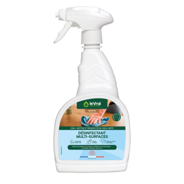 Désinfectant multi-surfaces prêt à l’emploi 2 en 1. Nettoie et élimine bactéries, levures et virus. Idéal pour poignées, tables, jouets. Actif 100 % biosourcé à base d’acide lactique. Ecocertifié !